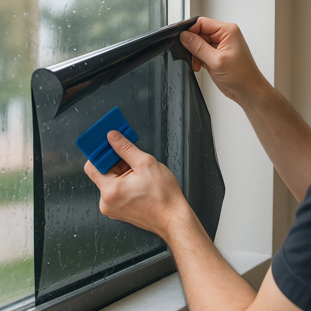 The film is then cut to size and applied to the window surface. A squeegee is used to remove any air bubbles and ensure the film adheres properly. The film needs to cure for a few days, during which time it should not be disturbed.